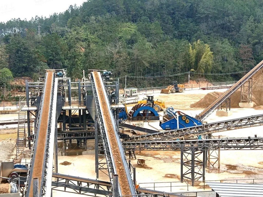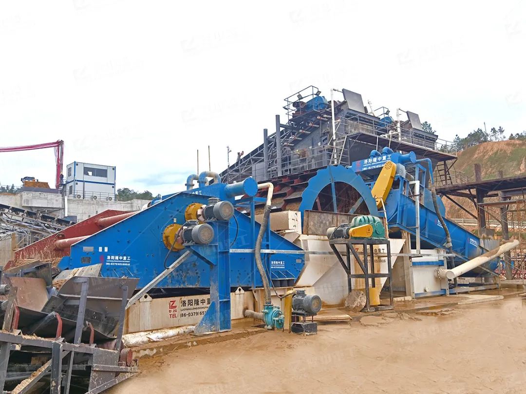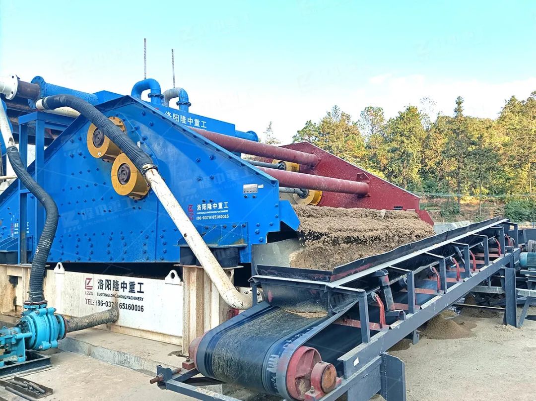 1、物料通過圓振篩篩分后通過溜槽進(jìn)入到多功能一體機(jī)進(jìn)行洗砂并脫水,脫水后的成品砂通過傳送帶運(yùn)至成品堆場;