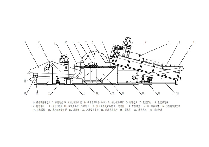 本機將輪斗洗砂機、螺旋洗砂機、尾礦脫水篩、分離器等部件結(jié)合為一體,使設(shè)備具有更強的物料清洗及回收能力。