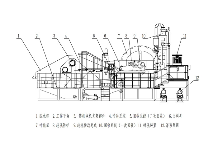 1、物料先經(jīng)過(guò)擦洗機(jī)進(jìn)行擦洗,除去砂顆粒表面附著的泥粉;擦洗后的物料進(jìn)入輪洗洗砂機(jī)進(jìn)行二次清洗、控水,達(dá)到泥沙分離效果,最后清洗后的粗、細(xì)砂進(jìn)入脫水篩進(jìn)行脫水,因此實(shí)現(xiàn)高效洗砂。