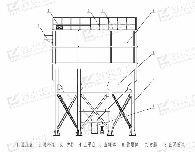 處理物料的廢水經(jīng)過料道進入中心進料筒,并經(jīng)過緩流、絮凝等一系列作用,使增稠的底流泥漿由罐體底部的出料口排出,并進入壓濾機等其他設備,壓濾成泥餅。罐體上部產(chǎn)生清潔度較高的清水(溢流澄清液),由頂部的出水口排出,清水可循環(huán)利用,實現(xiàn)生產(chǎn)廢水零排放。