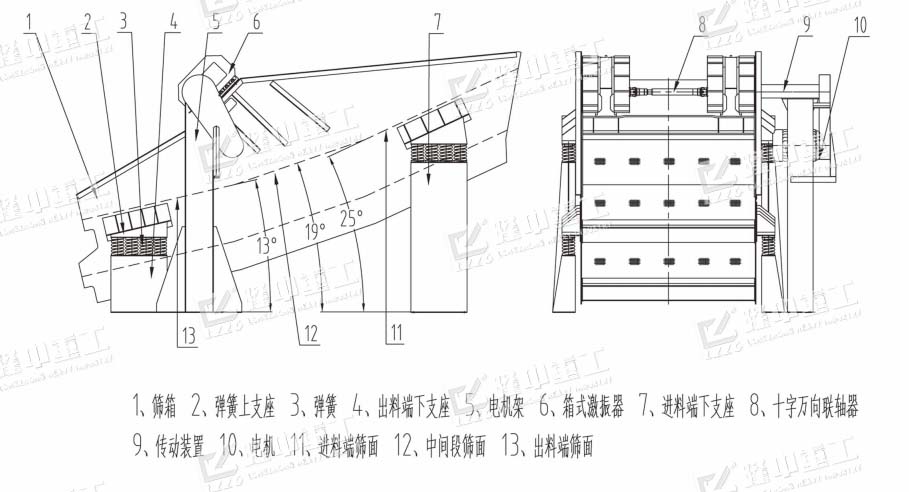 香蕉篩主要由篩箱、篩網(wǎng)、激振器、減振彈簧和下座架等組成。香蕉篩是由電動機(jī)和激振器作為振動源,激振器主要是由偏心軸、皮帶輪、軸承及軸承座等組成,激振器安裝在篩箱側(cè)板上,并由電動機(jī)通過三角皮帶或軟連接與其相連,電動機(jī)帶動偏心軸旋轉(zhuǎn),產(chǎn)生離心慣性力,迫使篩箱振動。