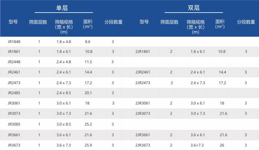 該系列根據(jù)篩機(jī)不同用途及處理量大小,采用不同的篩分面積、篩縫尺寸、篩面分段數(shù)量以及篩面傾角,分單層和雙層產(chǎn)品,工作面積5.7m2~30.2m2,共20種主要規(guī)格型號,可基本滿足各種類型礦井和選煤廠生產(chǎn)需要。